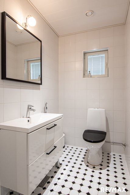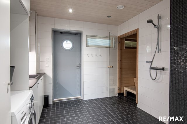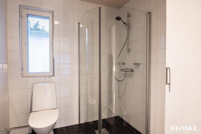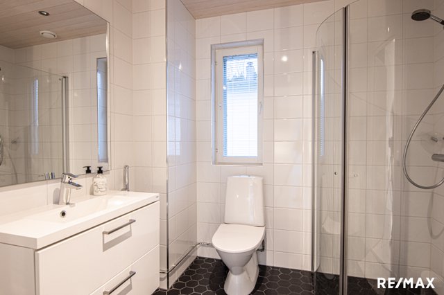- WC-istuin, suihku, suihkuseinä, pesukoneliitäntä, lattialämmitys, pesuallas, allaskaappi, bidee-suihku, ja peili