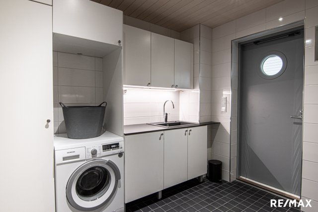 Alakerrasta löytyvät erillinen wc, kodin pesu- ja saunaosasto sekä niiden yhteydessä käytännöllinen kodinhoitohuone. Avarasta ja valoisasta olohuoneesta on käynti etelän suuntaiselle terassille, jossa voit nauttia auringosta ja rauhasta. Laadukas keittiö on suunniteltu arjen sujuvuutta ja yhteisiä hetkiä varten.