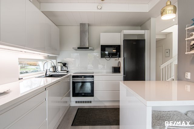 - Jääkaappi, liesi, liesituuletin, mikroaaltouuni, keittiösaareke, astianpesukone, ja uuni