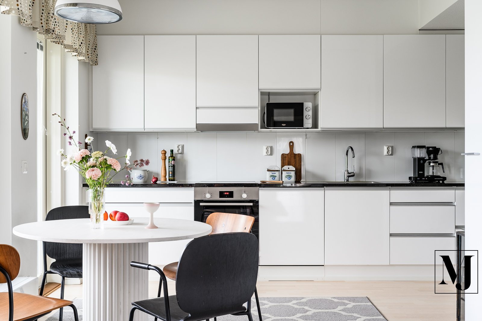Valoisa olohuone ja tyylikäs keittiö muodostavat yhtenäisen kokonaisuuden, jossa on ilo viettää aikaa. Keittiön korkeakiiltoiset kaapistot, integroidut kodinkoneet, kivitasot ja runsas säilytystila tekevät siitä sekä näyttävän että käytännöllisen. Kaksi tilavaa makuuhuonetta mukautuvat monenlaisiin tarpeisiin ja tilaa löytyy niin lepoon kuin etätyöpisteellekin.