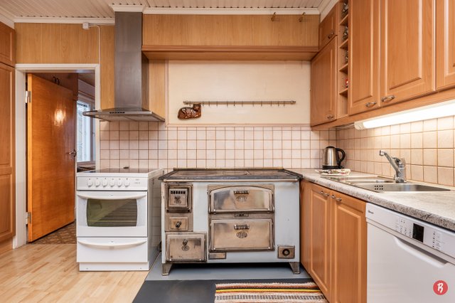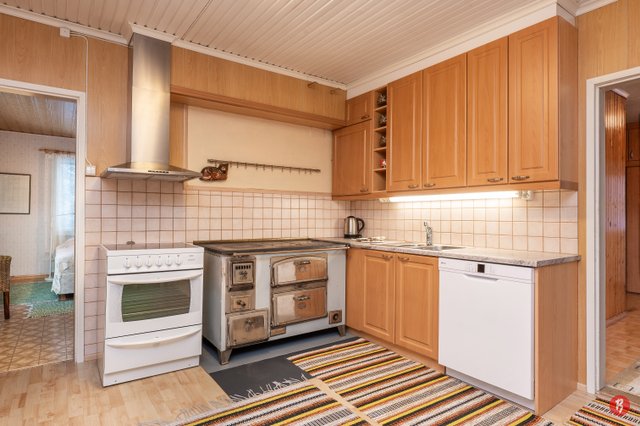 - Yläkerran keittiössä: valurauta liesi, liesituuletin ja jää-/pakastinkaappi Alakerran keittiössä: keraaminen liesi, liestiuuletin, puuhella, astianpesukone, jää-/pakastinkaappi