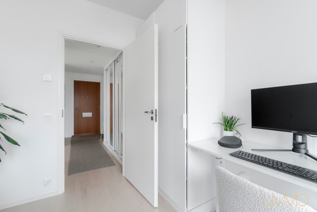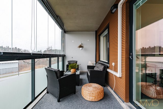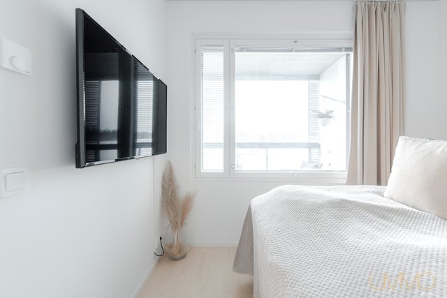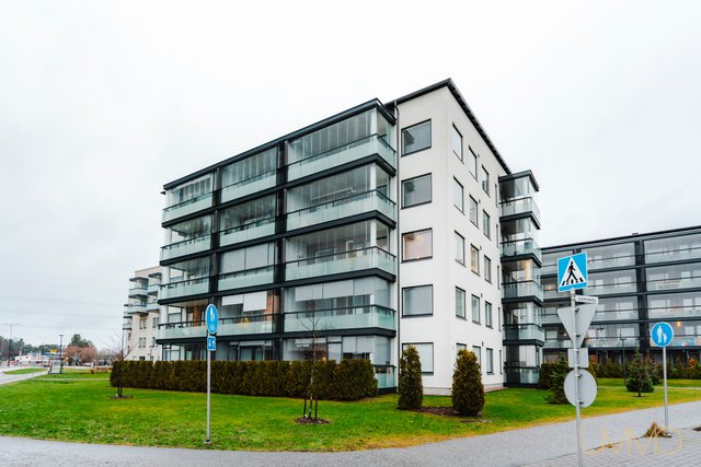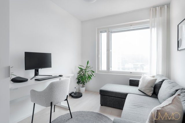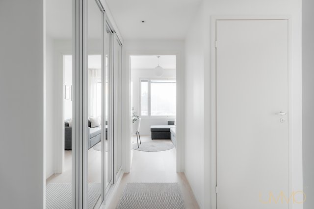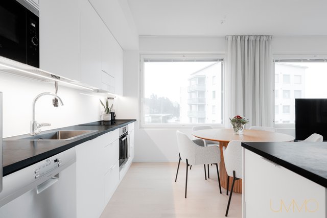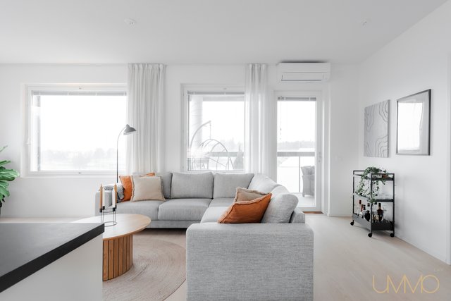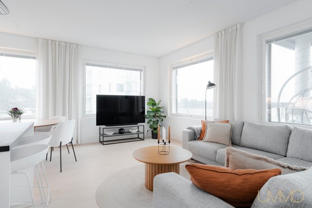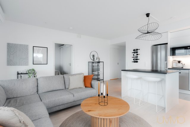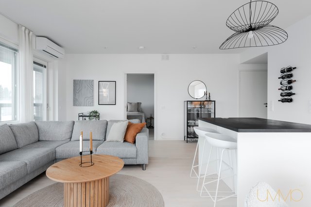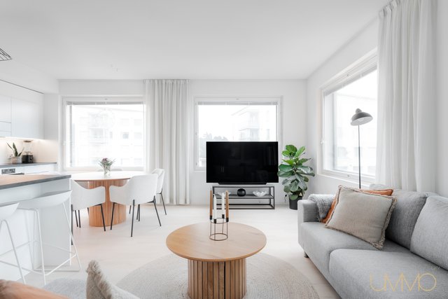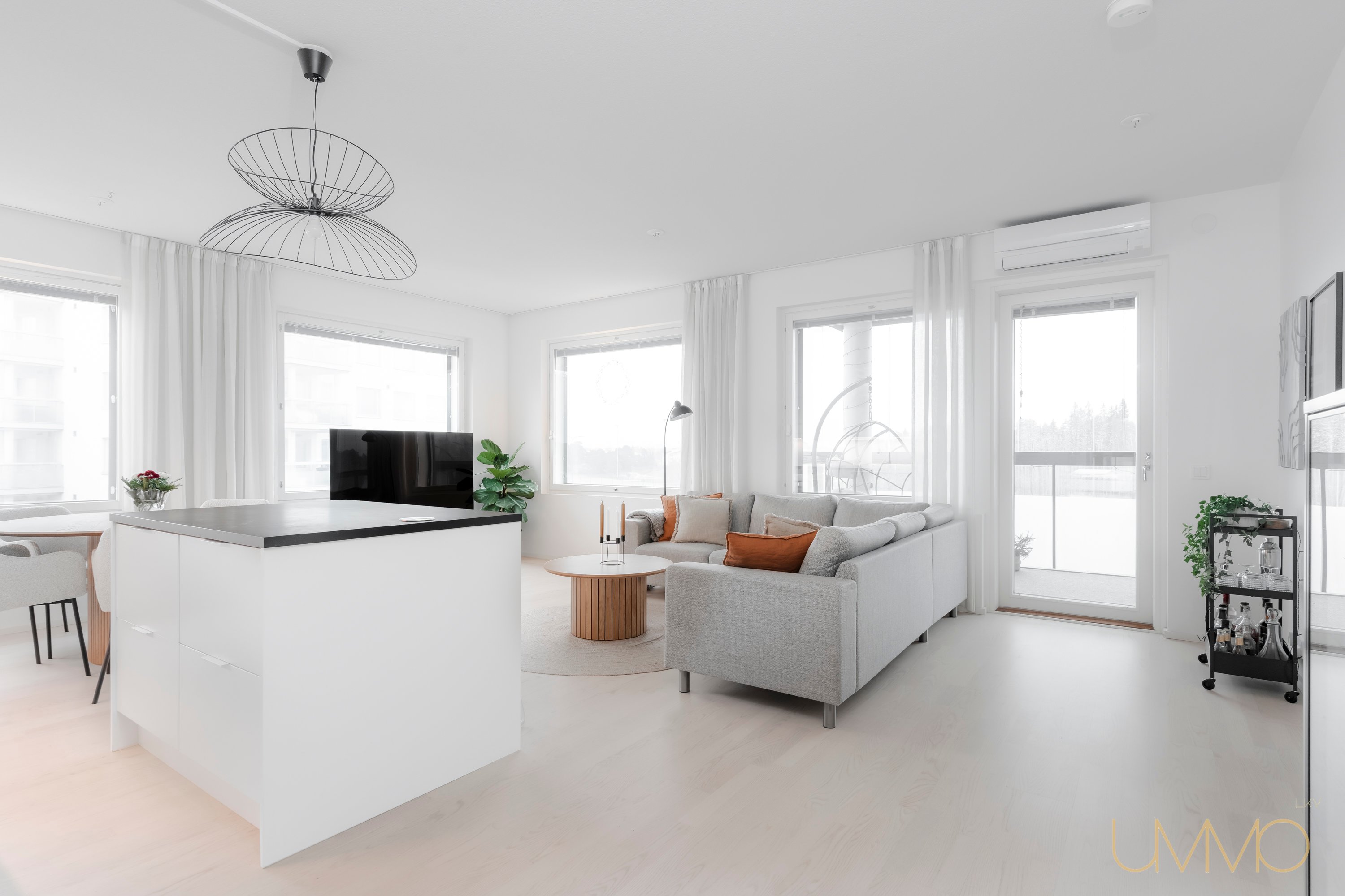 Tämä vuonna 2021 valmistunut 78,5 neliön asunto sijaitsee kolmannessa kerroksessa, jossa on hissi. Asunnon suuret ikkunat tarjoavat upeat näkymät ja tekevät asunnosta todella valoisan. Olohuone on todella upea ja keittiö sulautuu kauniisti kokonaisuuteen.