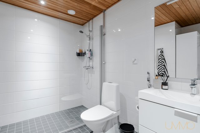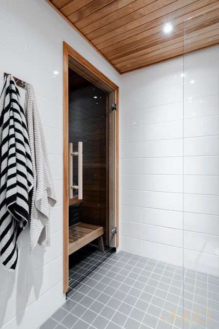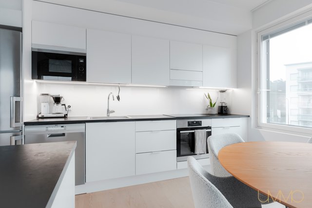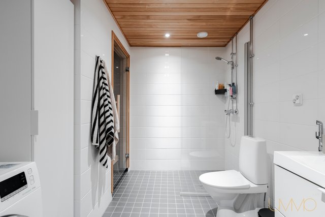 Keittiö on varustettu laadukkailla kodinkoneilla, kuten erillisellä uunilla, induktioliedellä ja astianpesukoneella, mikä tekee ruoanlaitosta sujuvaa ja nautinnollista. Lisätilaa kokkailuille tuo keittiön saareke. Kylpyhuoneessa on mukavuuksia, kuten lattialämmitys ja pesukoneliitäntä. Asunnossa on myös oma sauna, jossa rentoutuminen on taattua.