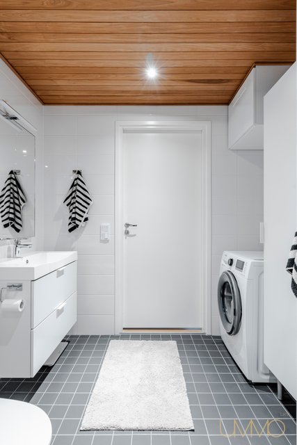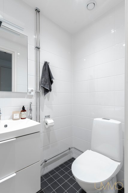 - WC-istuin, suihku, suihkuseinä, lattialämmitys, bidee-suihku, allaskaappi, pesuallas, pesukoneliitäntä, ja peili