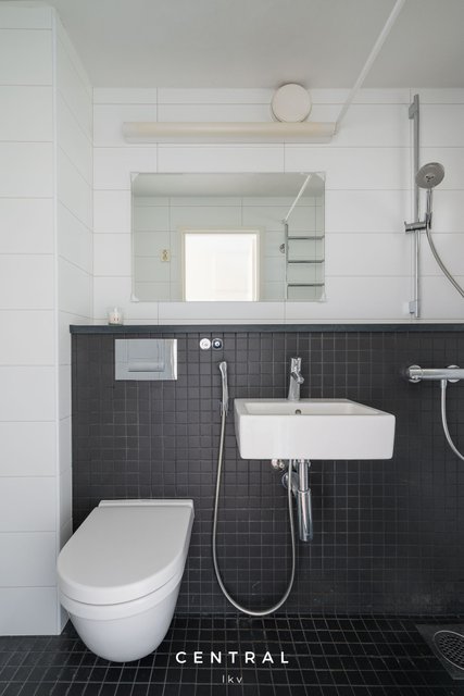 - WC-istuin (seinä-wc), suihku, bidee-suihku, rättipatteri, peilikaappi, ja pesuallas