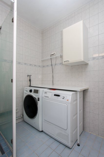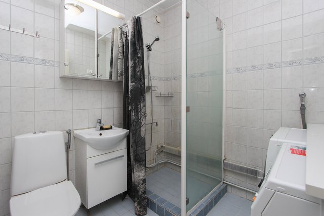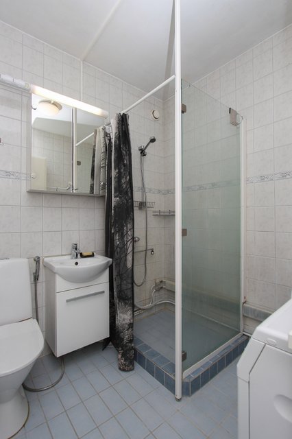- WC-istuin, suihkuseinä, pesukoneliitäntä, peilikaappi, pesuallas, allaskaappi, ja bidee-suihku