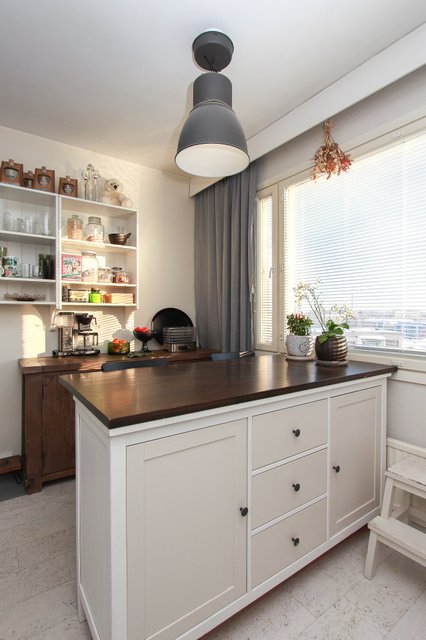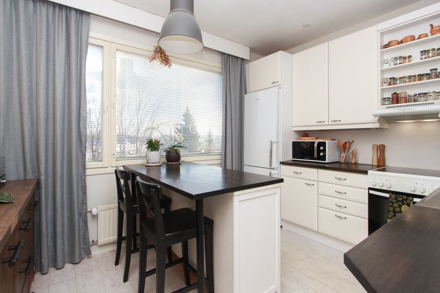 - Keittiön saareke ja seinähylly. Parvekkeen puuritilät. Sälekaihtimet