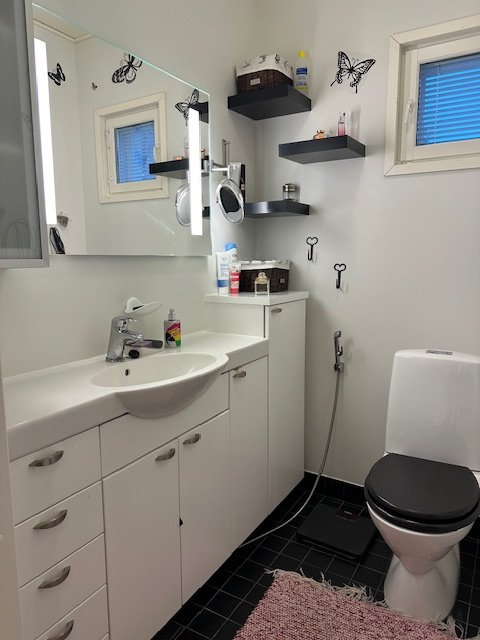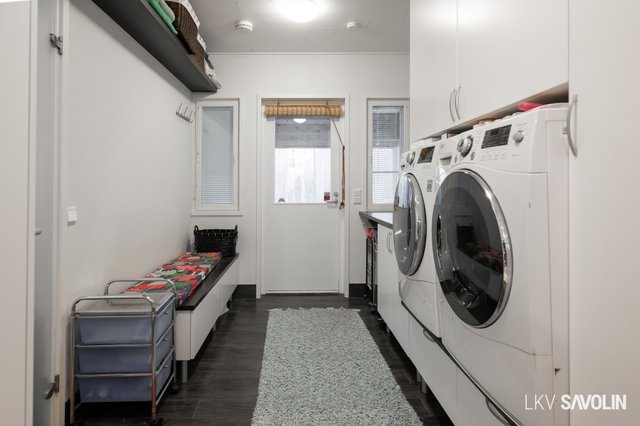 - Pesukoneliitäntä, lattialämmitys, pesuallas, pöytätaso, korotettu tila pyykinpesukoneelle ja kuivausrummulle, ja pyykkikaapit