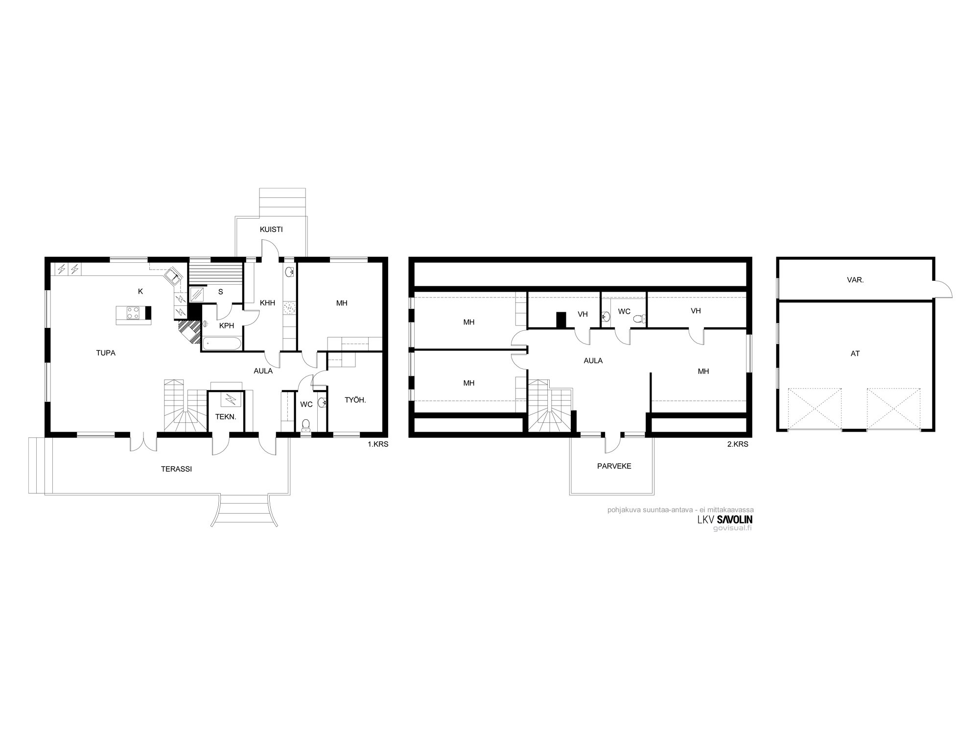 - Pinta-alatiedot saatu rakennuslupapiirustuksista. Asuintilojen pinta-alana ilmoitettu piirustusten huoneistoala (1. kerros 105m2 + 2. kerros 74m2). Muihin tiloihin kirjattu tekninen tila 2,5m2. Autotalli 40m2 ja sen yhteydessä oleva varasto 13m2. Autotalli-varastorakennuksen kerrosala 57m2.