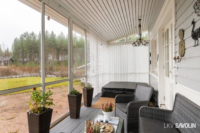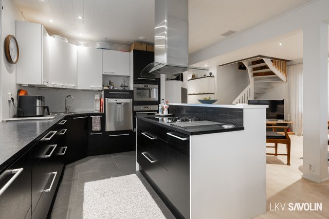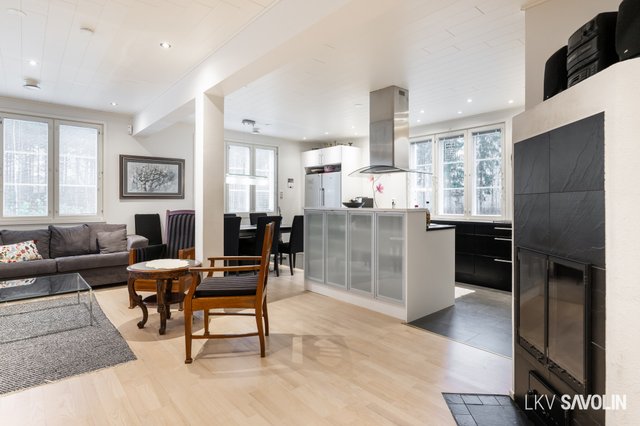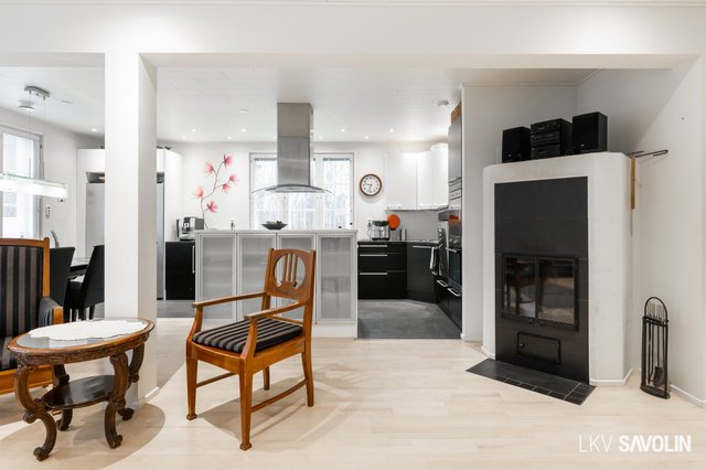 Talon tilavat ja valoisat huoneet luovat toimivan ja kodikkaan ympäristön perheen tarpeisiin. Kodin sydämenä toimii avara olohuone, jonka varaava takka tuo lämpöä ja tunnelmaa niin arkeen kuin juhlaan. Keittiö on varusteltu nykyaikaisin laittein, ja kätevä saareke lisää sekä työskentely- että säilytystilaa. Erikoisuutena keittiössä on myös kaasuliesi – täydellinen valinta innokkaalle kotikokille.