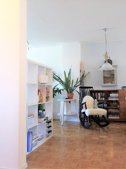 Tällä hetkellä yhtenäisenä tilana olohuone-ruokailutila, väliseinällä saat tarvittaessa lisämakuuhuoneen tai työhuoneen.