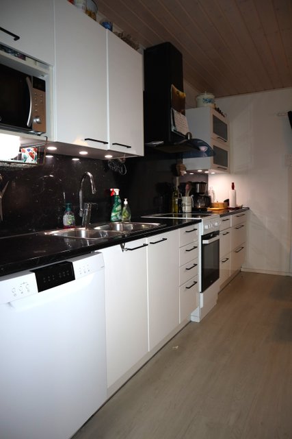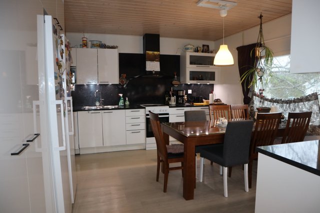 - Upea 2020 uusittu keittiö valkoisin kaapistoin. Reilusti kaappeja ja työtasoja sekä hyvä tila isommallekin ruokapöydälle. Kodinkoneina täyskorkeat jääkaappi ja pakastin, astianpesukone, liesi ja -tuuletin. Lattia vinyyliä.