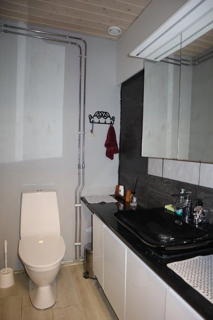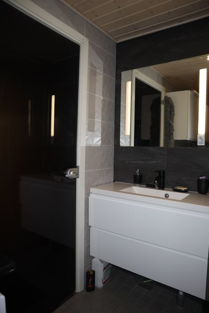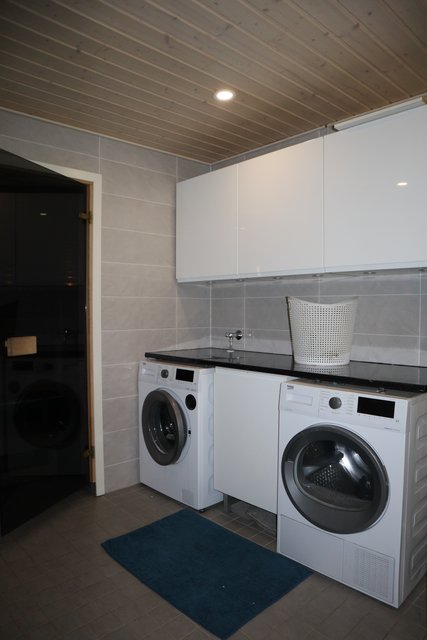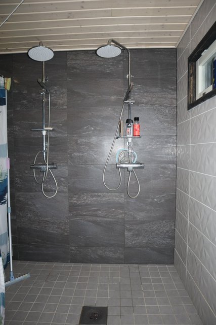 - Tilava laatoitettu pesuhuone, jossa kaksi sadesuihkua sekä reilusti tilaa kodinhoidolle. Kaksi wc:tä. Kylpyhuoneesta on kulku lasitetulle terassille.