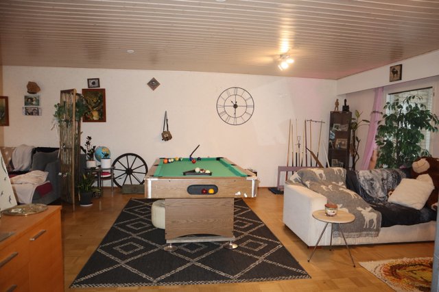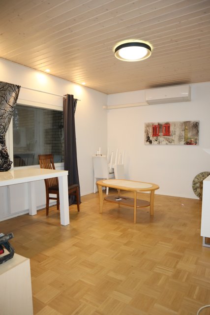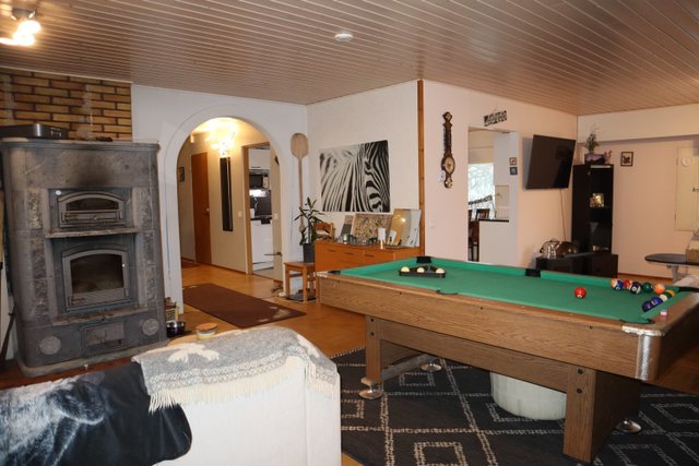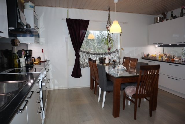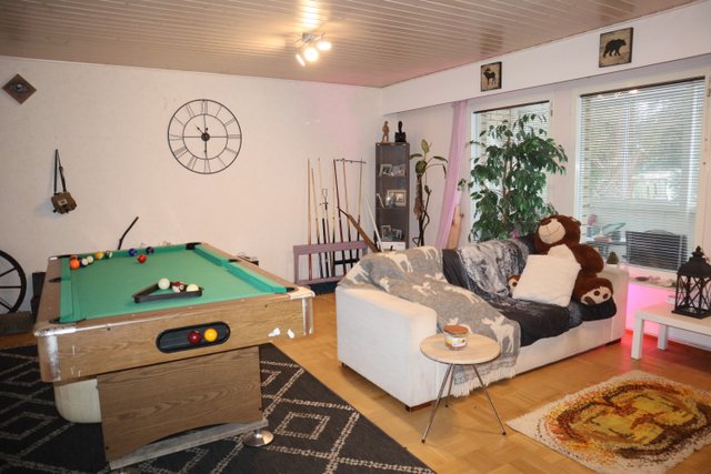 Suuri olohuone, jossa tilaa monenlaiseen oleiluun ja harrasteluun tai mahdollista jakaa vaikka kahdeksi huoneeksi. Myös keittiö on tilava ja 2020 uusitut kaapistot tarjoavat runsaasti säilytystilaa ja työtasojakin löytyy kiitettävästi. Ruokapöydälle paikka ikkunan äärellä.