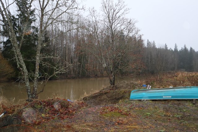 - Tynnyrisauna ja pieni puuvaja joen rannassa