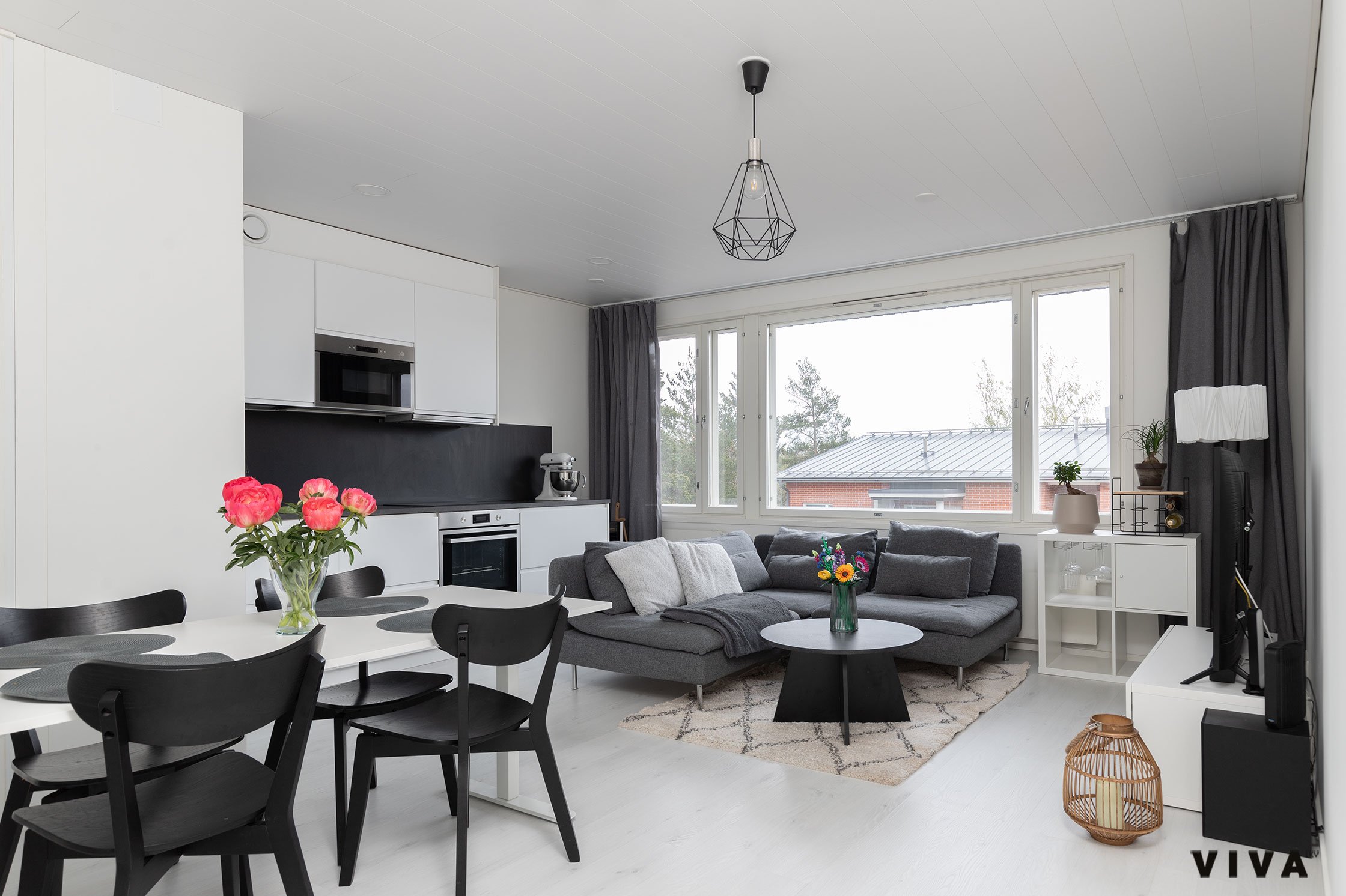 Tässä kodissa yhdistyvät valo, toimivuus ja fiksut ratkaisut. Avoin olohuone ja moderni keittiö muodostavat kodin sydämen – tilan, jossa on mukava viettää aikaa, kokkailla ja kutsua ystävät kylään. Vuonna 2022 täysin uusittu keittiö on varusteltu integroiduin kodinkonein ja tarjoaa hyvin säilytys- ja työskentelytilaa.