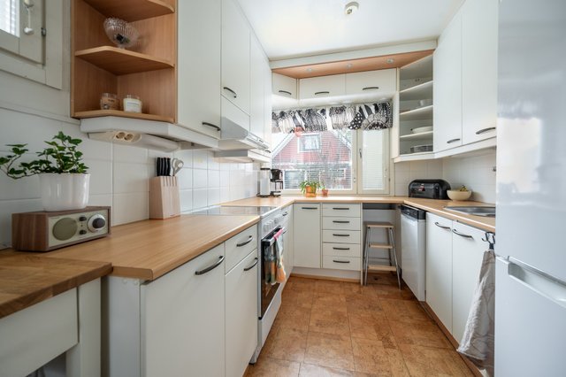 - Ikkunallisessa vaaleasävyisessä keittiössä runsaasti kaappi- ja laskutilaa.