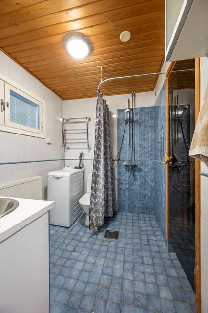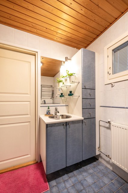 - WC-istuin, suihku, pesukoneliitäntä, pesuallas, lattialämmitys, peili, allaskaappi, ja pyyhekuivain