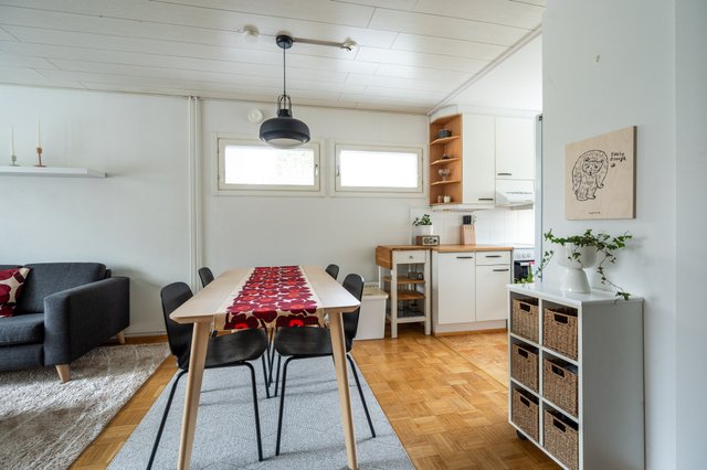 Asunnon pohjaratkaisu on toimiva ja tilat ovat hyvin suunniteltuja. Valo tulvii sisään suurista ikkunoista, ja avara olohuone kutsuu rentoutumaan perheen ja ystävien kanssa. Olohuoneesta on tarvittaessa mahdollista muodostaa ikkunallinen makuuhuone tai työtila. Keittiö on vaaleasävyinen ja käytännöllinen, tarjoten runsaasti kaappi- ja laskutilaa. Sauna ja tilava terassi tuovat mukavuutta arkeen.
