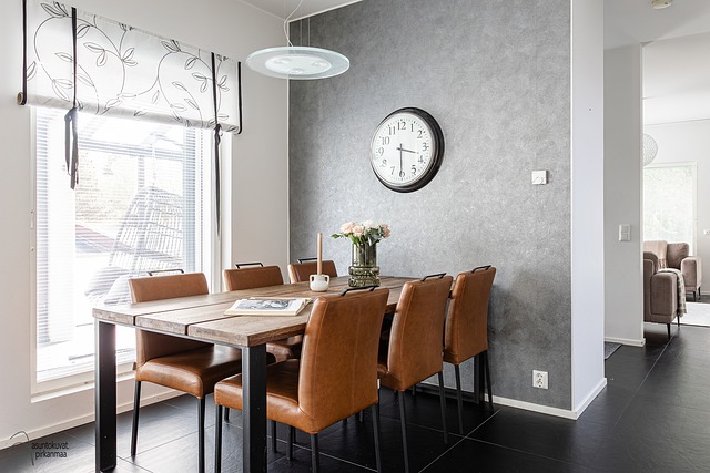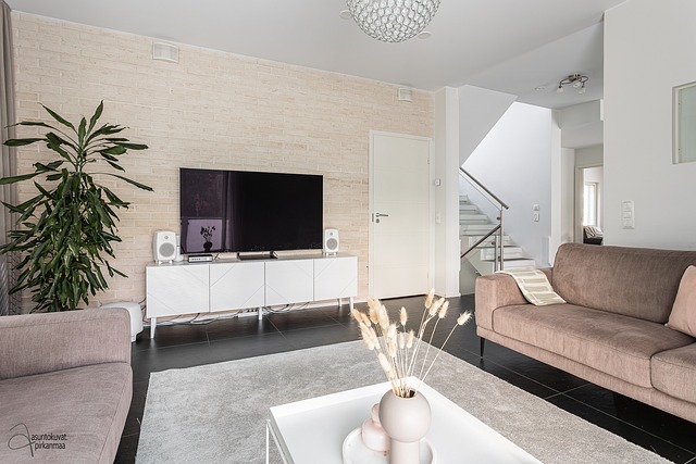 - Tilava olohuone, josta käynti myös takapihalle. Lattiapinnat laattaa, seinäpinnat maalattu, osin tapetoitu ja tiili.