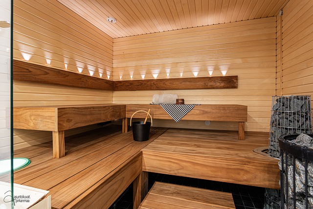 - Todella tyylikäs sauna jossa sähkökiuas sekä puukiuas. Puukiukaan tulipesä on takkahuoneen puolella. Kiinteä vesipiste. Varustus: lauteet, sähkökiuas, puukiuas, integroitu kiulu vesipisteellä ja kiinteät valaisimet. Lattiapinnat laatoitettu, seinäpinnat paneelia.