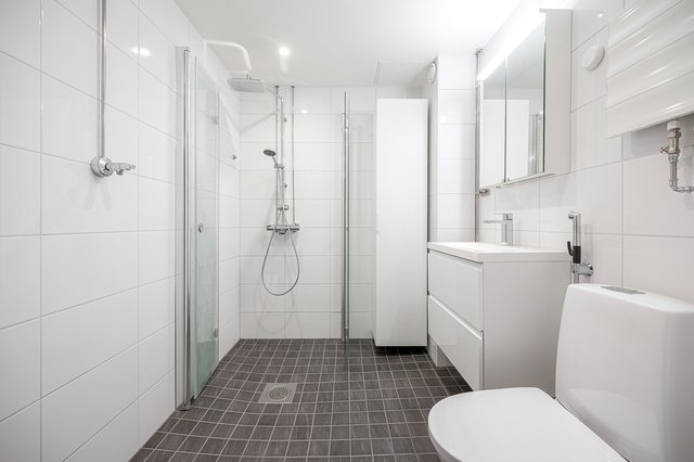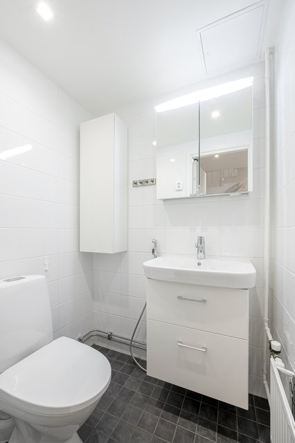 - WC-istuin, suihku, suihkuseinä, pesukoneliitäntä, peilikaappi, allaskaappi, pesuallas, kulmakaappi, ja bidee-suihku