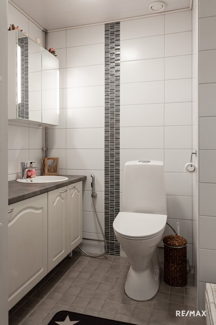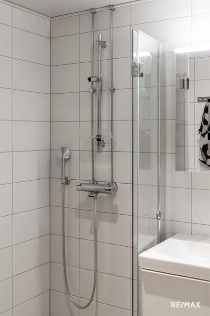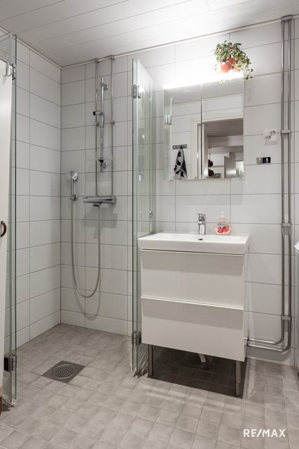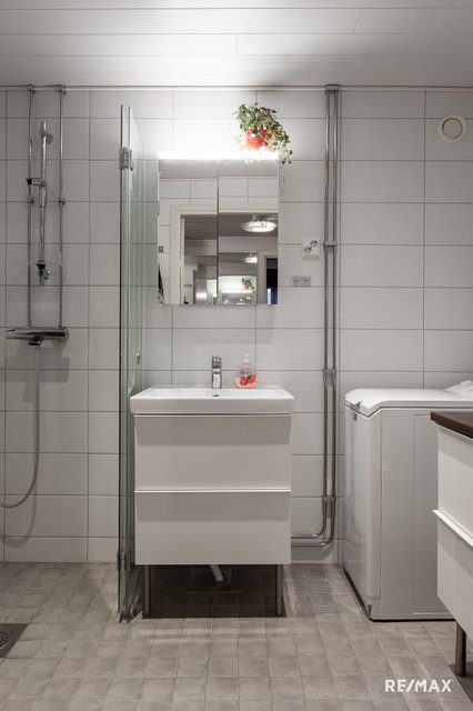 - Suihku, suihkuseinä, pesukoneliitäntä, lattialämmitys, peilikaappi, pesuallas, ja allaskaappi