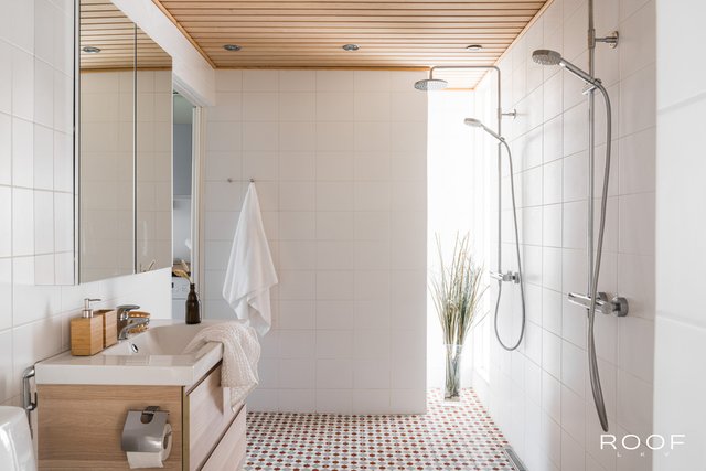 - 2 pesuhuonetta. Toinen keskikerroksessa: 2 sadesuihkua, wc-istuin, lavuraari, sekä nykyaikainen linjalattiakaivo seinän vieressä ja kulku myös kodinhoitotiloihin. Toinen saunan kanssa kellarikerroksessa: 2 suihkua.