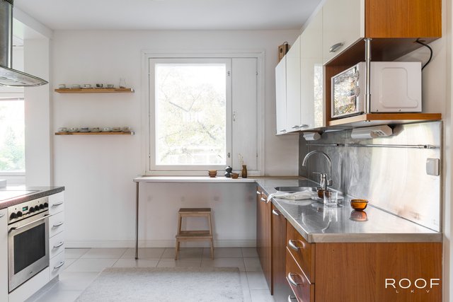 - Astianpesukone, jääkaappipakastin (side-by-side), kiinteät valaisimet, liesituuletin / hormi. Liesi: keraaminen. Työtasot: puu, kivi. Lattia: laatta. Seinät: maalattu ja välitilalevyä.