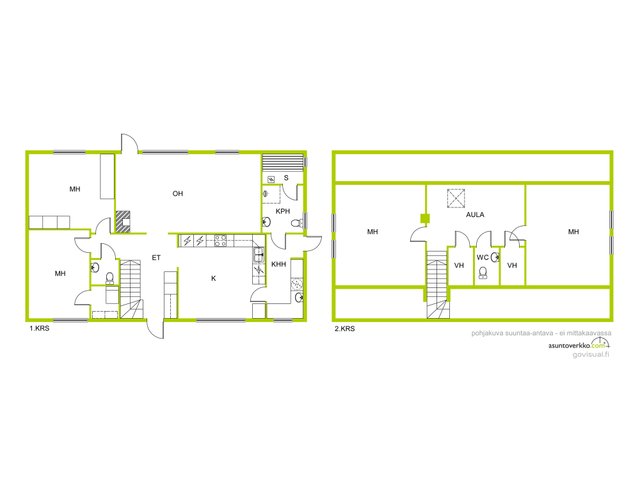Alakerta: 2x mh + oh + et + k + khh + psh + s + vh + wc. Yläkerta: aula + 2x mh + 2x vh + wc.