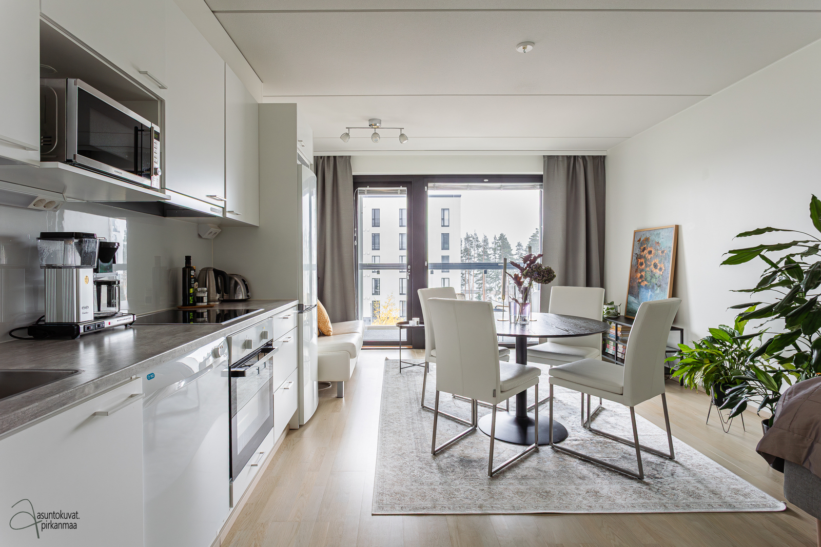 Maisemasta voi nauttia niin lasitetulta parvekkeelta, kuin lähes koko seinän mittaisen ikkunan takaa. Mustat karmit tuovat kontrastia muuten vaaleilla materiaaleilla toteutettuun tilaan. Yksiössä on poikkeuksellisen paljon säilytystilaa ja alkovi tuo mahtavan lisän sängyn sijoitteluun.