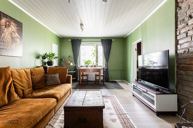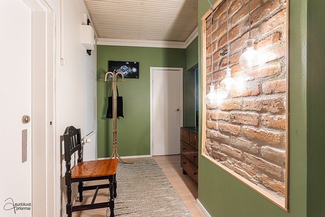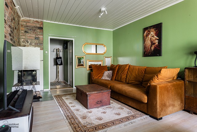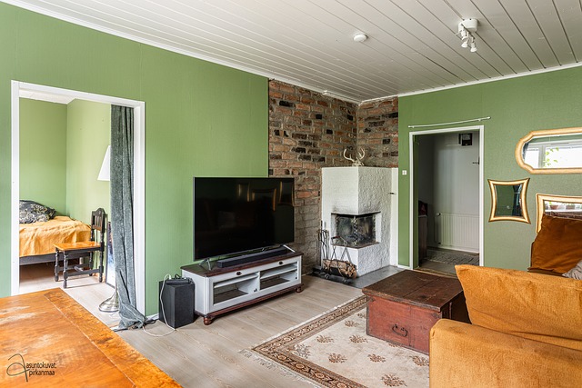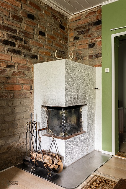 - Osa olohuoneen seinästä avattu tiilirakenteisiin asti. Olohuoneessa on takka.