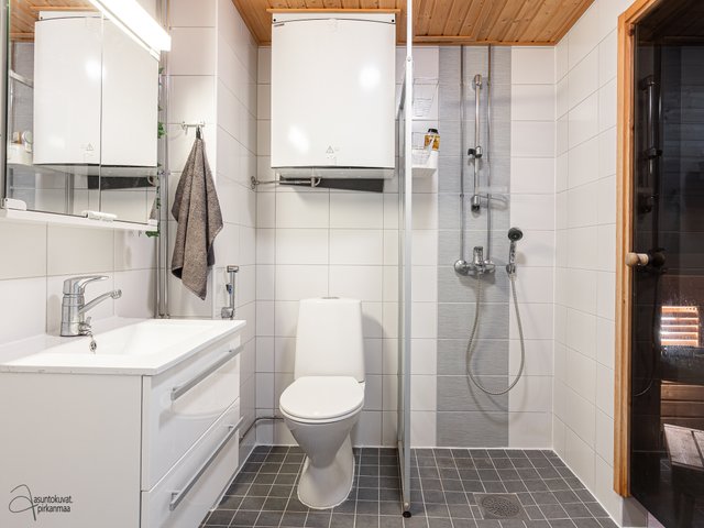 - WC-istuin, suihku, suihkuseinä, pesukoneliitäntä, lattialämmitys, peilikaappi, allaskaappi, ja bidee-suihku