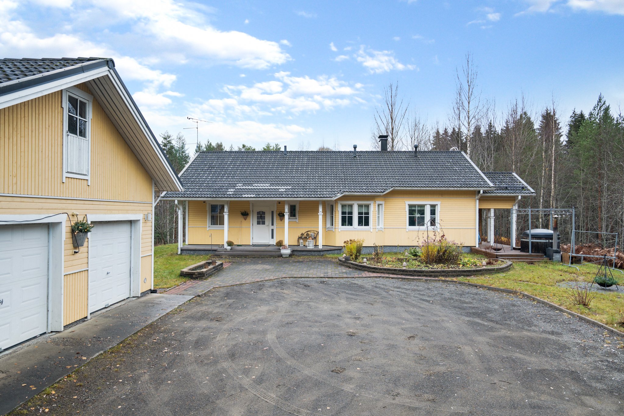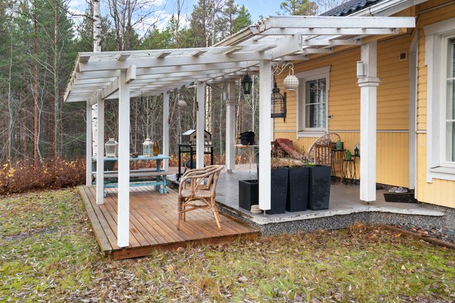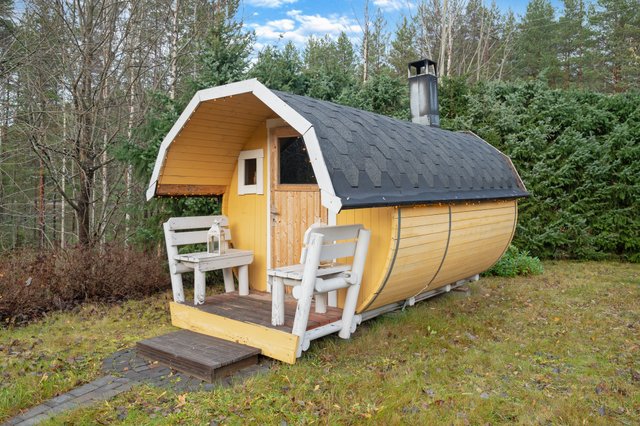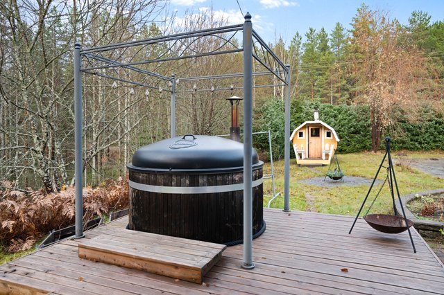 Pihapiiri on hyvin hoidettu ja monipuolinen: pihalta löytyvät tynnyrisauna, kahden auton autotalli, jonka yhteydessä on kellaritila ja nukkuma-aitta, sekä puuliiteri ja kasvihuone. Talon takaosaa ja sivustaa kiertää laaja katettu terassi, jonka yhteydessä on palju.