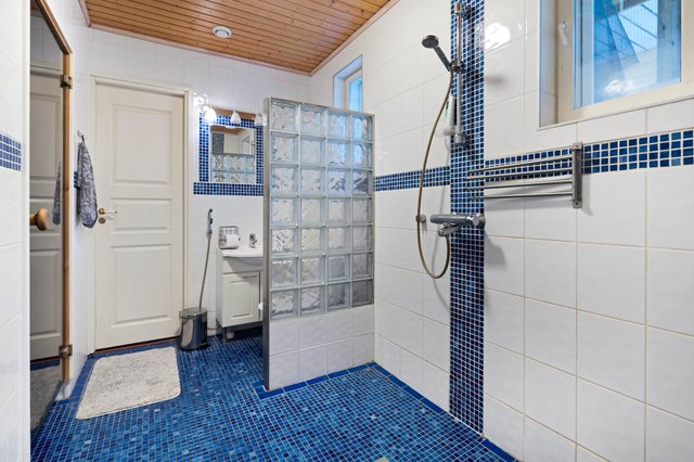 - WC-istuin, suihku (kaksi suihkua), suihkuseinä, lattialämmitys, peilikaappi, pesuallas, allaskaappi, ja bidee-suihku