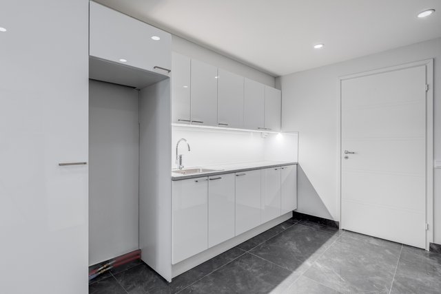 - Pesukoneliitäntä, lattialämmitys, pesuallas, lattiakaivo, tila pesutornille, pöytätaso, ja käsienpesuallas