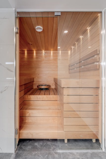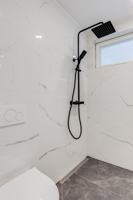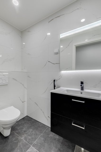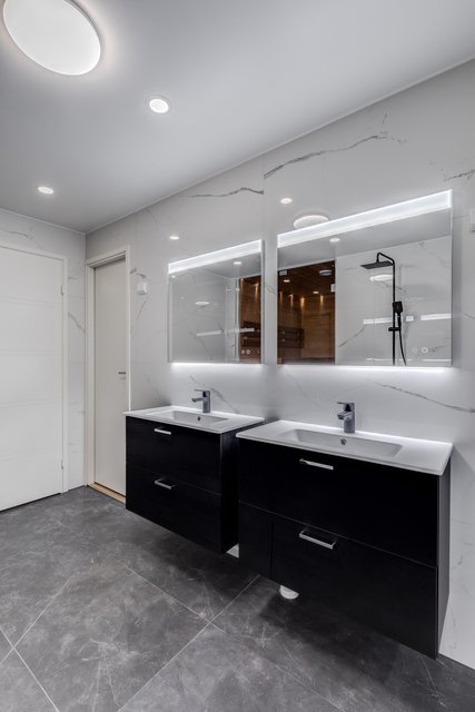 - Suihku (x 2 sadesuihku (Svedberg)), unidrain linjalattiakaivo, pesuallas (x 2 (Temal)), wc-istuin (Seinämalli (Ido)), allaskaappi (x 2 (Temal)), bidee-suihku, peili (x 2 Valaistu), ja lattialämmitys