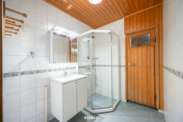 - - Suihku - Suihkukaappi - Allaskaappi - Peilikaappi - Pesukoneliitäntä Lattia: laatta Seinät: laatta