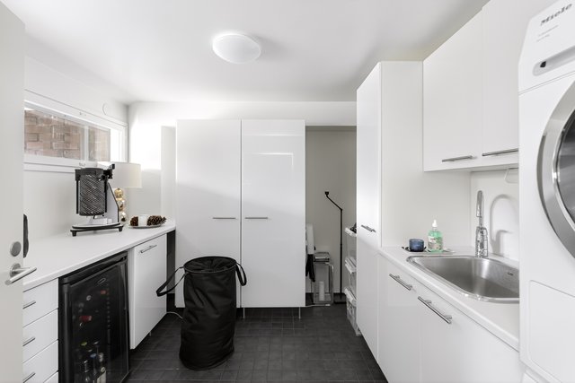 - Pesukoneliitäntä, pesuallas, tila pesutornille, pyykkikaapit, ja lattiakaivo