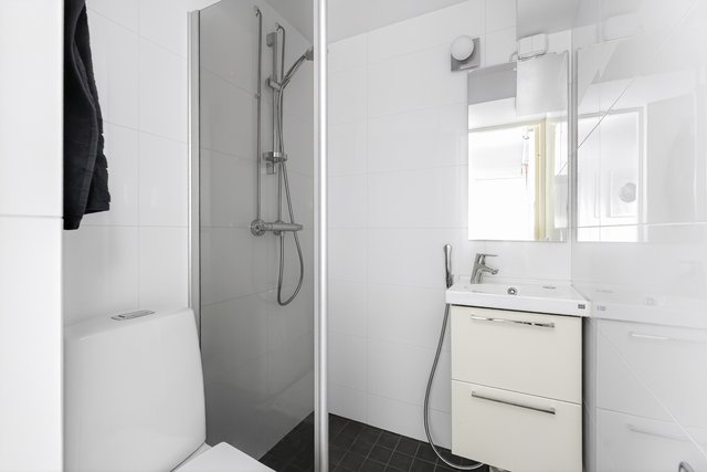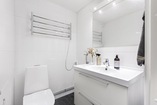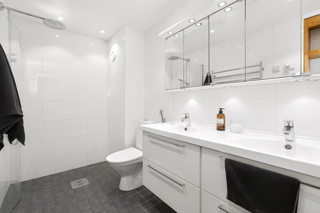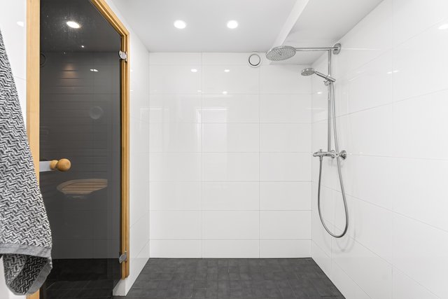 - Alakerrassa saunaosasto, jonka kylpyhuoneessa kaksi sadesuihkua. Seinät ja lattia laatoitettu. Alakerrassa toinen pieni wc/kylpyhuone, jossa suihku, peili, allaskaappi ja wc-istuin. Seinät ja lattia laatoitettu. Yläkerrassa kylpyhuone, jossa sadesuihku,wc-istuin, peilikaappi, allaskaapisto tupla-altailla. Seinät ja lattia laatoitettu, lattialämmitys.