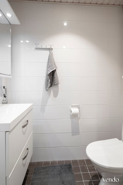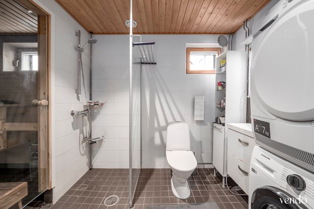 - Suihku, suihkuseinä, pesukoneliitäntä, peilikaappi, lattialämmitys, allaskaappi, ja wc-istuin