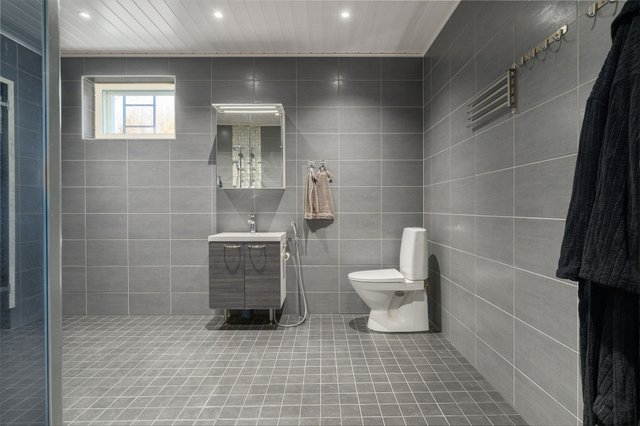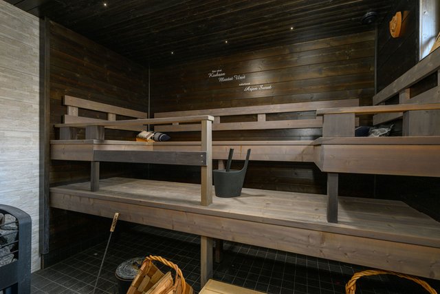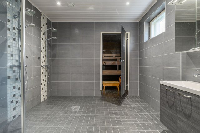 Kylpyhuoneessa on kaksi suihkua ja lattialämmitys, mikä tuo arkeen ripauksen luksusta. Oma sauna puukiukaalla tarjoaa rentoutumismahdollisuuden kiireisen päivän päätteeksi. Kodinhoitohuoneessa on oma uloskäynti, joka helpottaa arjen askareita.