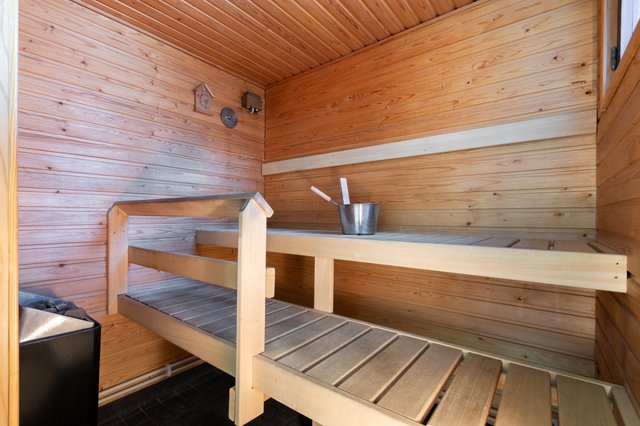 - Oma sauna. Lattia: laatta. Seinät: puu. Kiukaan tyyppi: sähkökiuas.