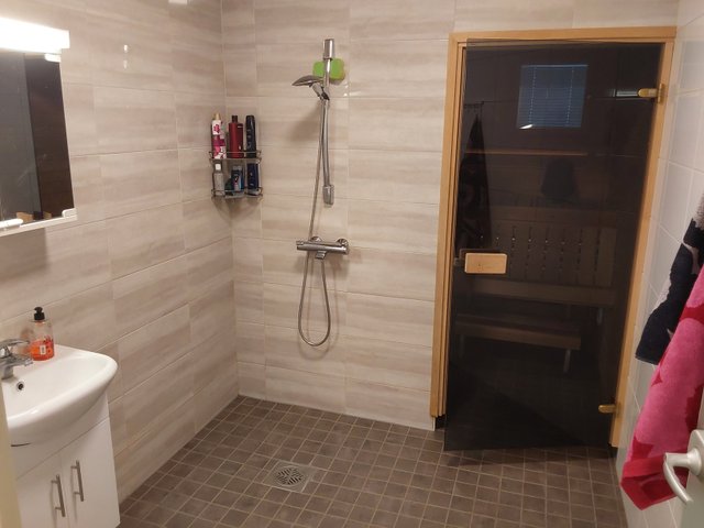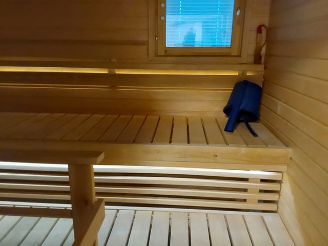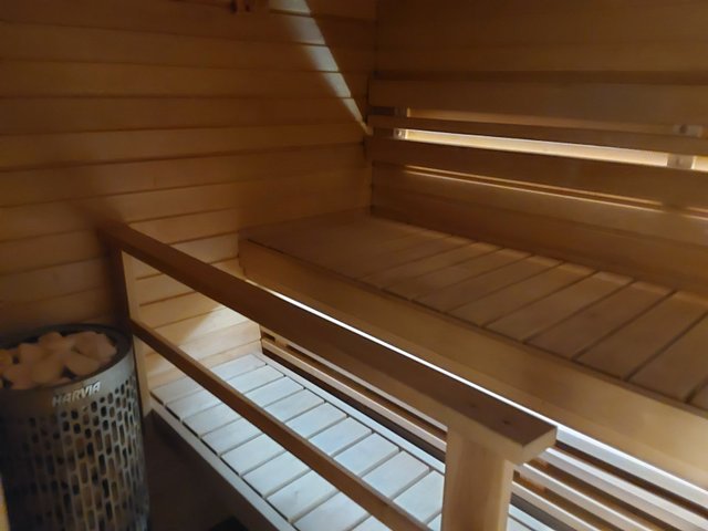 - Ikkuna. Sähkökiuas (Harvia Cilindro plus spot), jonka ohjaus tapahtuu kodinhoitohuoneen seinässä olevasta säätimestä. Kiukaassa keraamiset kivet.