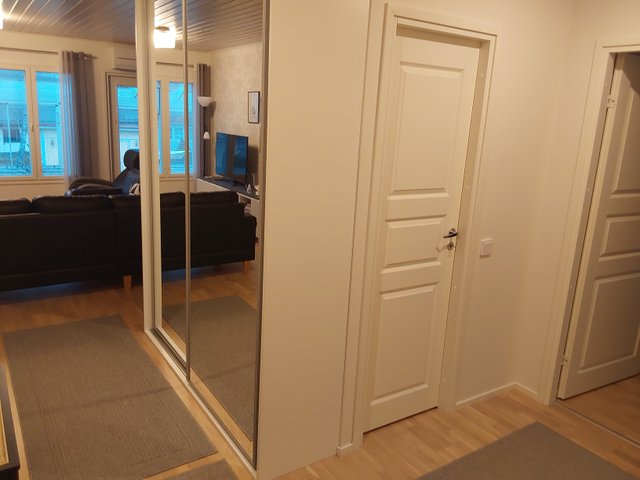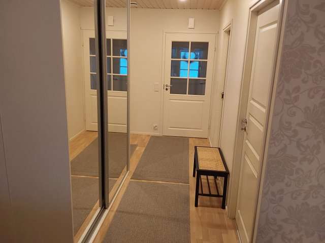 - Tuulikaapin liukuovikaapisto, eteisen korkea peililiukuovikaapisto, makuuhuoneiden liukuovikaapistot, vaatehuone, kylmä ulkovarasto (sähköistetty) ja lämmin varasto.