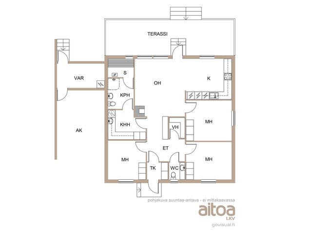 - Kylmä varasto n. 12 m², lasitettu terassi n. 30 m², lämmin varasto autokatoksen yhteydessä n. 8 m².