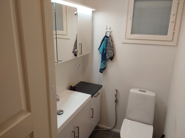 - Ikkuna, peilikaappi, pesuallas, allaskaapisto, bideesuihku, wc-istuin.