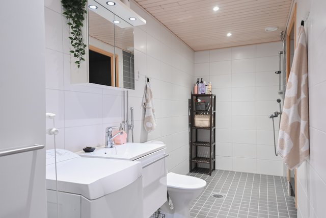- WC-istuin, suihku, pesukoneliitäntä, lattialämmitys, peilikaappi, pesuallas, allaskaappi, ja bidee-suihku