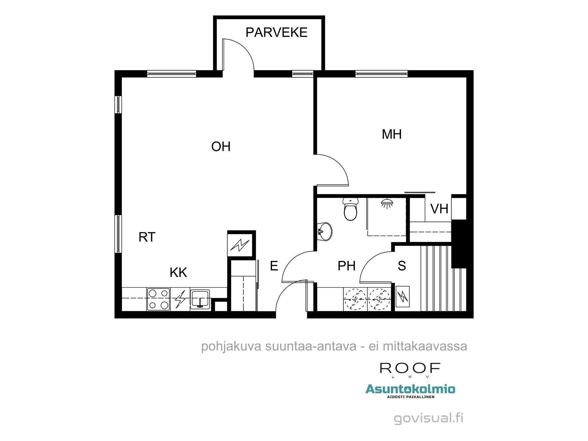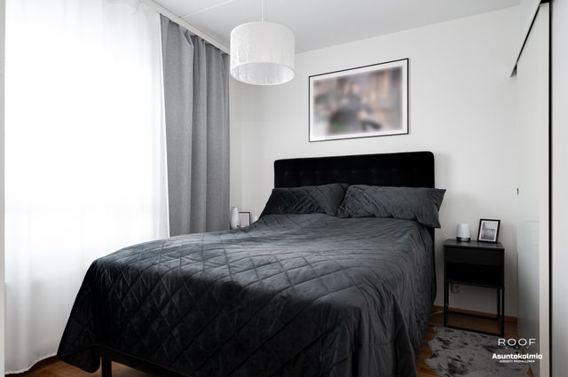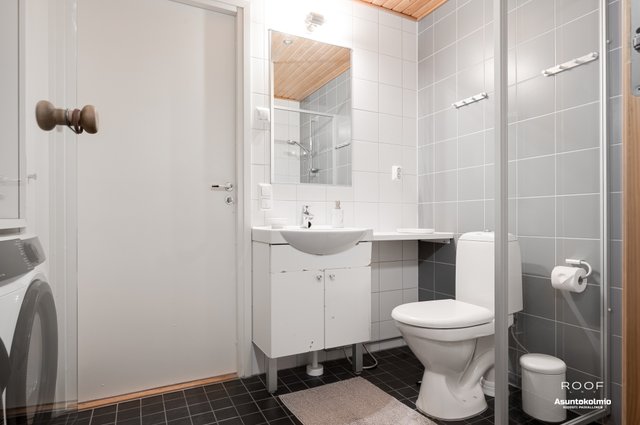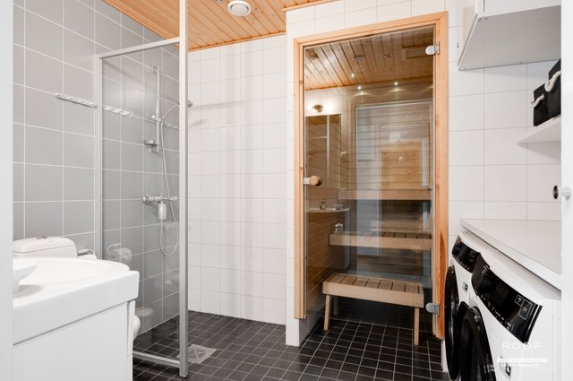 - Varustus: Lattialämmitys, pöytätasot, wc-istuin, suihkuseinä, allaskaapisto, pyykinpesukoneliitäntä, peili. Kylpyhuoneen silikonisaumat uusittu ja nanopinnoitus 2024.