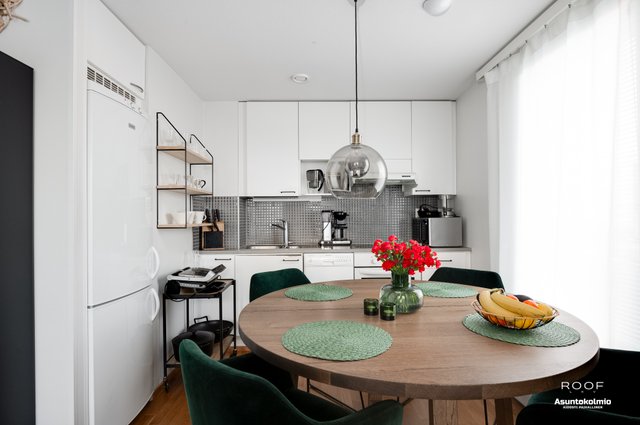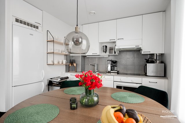 - Varustus: Jääkaappi/pakastin, keraaminen liesi, liesituuletin, astianpesukone, laminaattitasot.